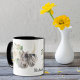 Behind this beautiful watercolor portrait of a Miniature Schnauzer dog on this mug is a pretty white rose bouquet. The bouquet and dog image are have an overlay swirl of faux glitter confetti. The image is printed on two sides, with your custom text in black at the centre bottom between the images. Perfect for anyone who has lost their heart to a mini Schnauzer. *Please note - the image is printed and does not contain actual glitter.