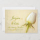 Beautiful single white rose bud on creamy modern rustic effect paper landscape wedding invitation. Edit this invitation with your own words and wedding details. Simple romantic invite. Design and photography by Sarah Trett.