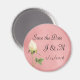 A Save the Date magnet with script letters and room for your custom text, decorated with a pretty white rosebud just starting to open on a cream and dusty pink background.