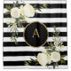 Give this gorgeous shower curtain as an elegant gift, or buy it for yourself! This black and white striped rich gold monogram curtain features a black circle monogram background element bordered with rich gold, and the design is embellished with beautiful white watercolor roses and delicate Autumn green foliage. This luxurious design would make a great gift for her, or a nice treat for yourself!