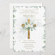 *** Message LeahG for the link to the Zazzle template that allows Digital Downloads *** .Elegant Christian, Catholic faith wedding invitation with text template fields both sides for you to include wedding ceremony, reception, rsvp, gift registry brief order of the day program. White Roses, greenery leaves, gold cross decorated invitation.