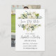 This design features an illustration of white roses with colourful vibrant foliage in watercolor style. Text "Save the date" is written in a Script.