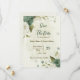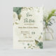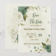 Beautiful romantic wedding save the date invitation featuring sage green and ivory white flowers and some gold leaves .