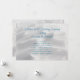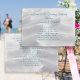 programme de mariage décontracté plage avec arrière - plan de sable blanc. Customisez le texte bleu des deux côtés du papier horizontal. Inclure un titre, l'ordre de la cérémonie et une liste des participants et des membres de la famille. Convient pour une petite cérémonie décontractée sur la plage ou à proximité.