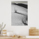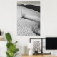 A black and white photograph captures a stark desert landscape at White Sands National Park. The scene is dominated by undulating sand dunes, their surfaces textured by wind patterns. In the foreground, tufts of yucca plants emerge from the sand, casting long, sharp shadows. A larger dune looms in the background, its shadow creating a contrast against the lighter sand.