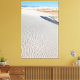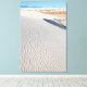 A panoramic view of the White Sands National Park in New Mexico, showcasing the iconic white gypsum sand dunes. The image captures the mesmerizing patterns created by the wind on the sand, forming gentle, undulating waves. The dunes stretch out towards the horizon, with a distant mountain range visible in the background.