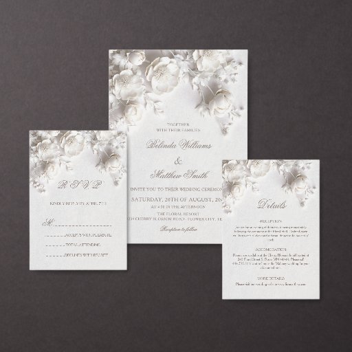 White Sculptured Floral 3D Roses Wedding Invitation