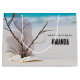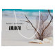 Gift bag with a gorgeous photograph. Tropical blue water and foamy surf in the background. A collection of seashells and stems set on a white sandy beach.