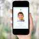 A white background, decorated with a sky blue frame, and a white cross Personalize and add a photo name and details. Blue text. Arch shaped photo frame.