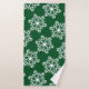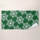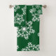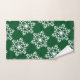 Beautiful Christmas bath towels with a white snowflake pattern on a dark green background.
