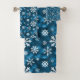 Destei's decorative white snowflake pattern over an abstract blue background.