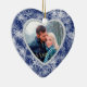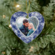 This holiday keepsake ornament features your own photograph within a pretty heart shaped faux diamond frame. The frame is bordered with ornate white snowflakes falling against a dark blue background. The other side has the same blue and white snowflake border and diamond frame with your custom text on the matching blue interior. An elegant and festive keepsake gift for newlyweds.