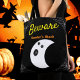 Trick or treat Bag With "Beware" and personalized text Black with White Spider Webs and cute Modern Ghost Fun and Friendly Frightful Halloween Party / Haunted House Party.