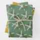 Sheets of wrapping paper with white sea stars pattern. Gold and green paper set with each of three papers containing realistic white starfish wrapped in holly leaves. The patterns are various sizes in this variety set.