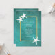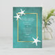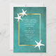 White starfish on teal stained grunge paper modern beach wedding invitation or invite featuring a gold frame on dark aqua teal blue background and white starfish on the corners. This elegant summer wedding design is part of a wedding set or collection and is a totally customizable template perfect for a beach destination summer wedding.