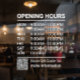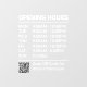 Simple and elegant store hours window cling template in white colour. Add your QR code and other information needed beneath the opening hours for your visitors and customers.