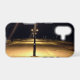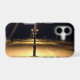 The image on this iPhone 17 Case is an original photograph by ZoeSPEAK of the White Street Pier in Key West, Florida. The pier extends out into the waters of the Gulf of Mexico. The photo was taken on a breezy night when no one was around. The empty pier is lit up by a row of lamp posts with two lights each. The sky is dark, and the lights glow like fuzzy balls in the night sky, giving the scene an eery feeling.