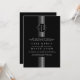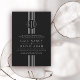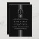 White stripes and initials black wedding invitation. It displays white vertical stripes in the centre with a circle with your initials and two little hearts and your text. The back is of solid black colour.