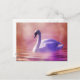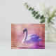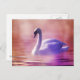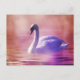 A charming whimsical fairytale image. Soft romantic photo of a white swan cast in purple lighting swimming on a misty lake. Colourful purples and pinks create a mystical magical mood.