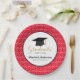 This graduation paper (disposable) plate features a graphic of a graduation hat (mortarboard) and customizable text for: Class of, Graduates Name, Name of School. This paper plate is accented with a white swirl pattern on a red background.