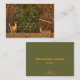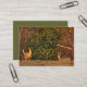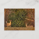 This fine art artist trading card features an early morning sunrise with two brown white-tailed deer (odocolleus virginianus) who have been sleeping at the foot of a green evergreen tree. Their eyes, neck and tail are white. The forest is tinged with orange light.