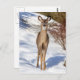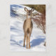 A close up image of a whitetail deer standing in a snowy field staring at the viewer.