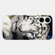 A striking white tiger with blue eyes looking straight at you, against a dark and, dreamy background. A bold and captivating image perfect for animal lovers.