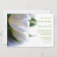 Formal white wedding party invitation with tulips photograph. Reception details printed on the back.