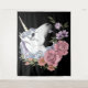 A white unicorn with pink, peach and lavender coloured flowers in a backdrop of black