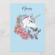 A white unicorn in profile is surrounded by pink, coral, and lavender flowers against a soft blue background.