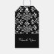 A custom Thank You tag with white script letters on black and an elegant background pattern of vintage leaves and flowers in white.