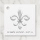 Favour tags featuring a silver fleur de lis emblem emblazoned with a diamond and a vintage lace burlap reverse.