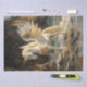 A white winged unicorn emerges from the sea, its golden-plated breastplate glinting as it steps onto a rugged shore. Waves crash behind this mythical stallion, evoking legends of Greek mythology where Pegasus aided Perseus. With powerful wings and no bridle, this untamed creature appears as if it has descended from the skies, bringing an air of fantasy and ancient storytelling.