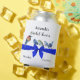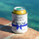 Get the party started with these fun custom blue and white can coolers featuring a blue ribbon on a white background with little birds on it and elegant black script typography.