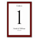 A classic burgundy and white wedding table number card that can be customized with any table number. The graphics appear on both sides of this card.