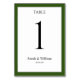 A classic pine forest green and white wedding table number card that can be customized with any table number. The graphics appear on both sides of this card.