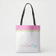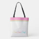 A pretty summer tote bag in white, featuring a top rim of pink orange and aqua . Colourful text of "Sun Sand Surf" included at the bottom. Customize to change text or add initials.