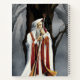 A wizard all in white, red and gold is holding a staff with both hands with a very old large oak tree behind him and a forest all around. A black raven is behind the shoulders of the wizard.