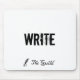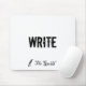 A plain white mousepad with the word "WRITE" and The Guild's logo in black and white.