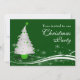 Festive green background with a white Christmas tree on the front side and a cartoon Santa Claus on the backside, both with festive green snowy backgrounds. Very modern contemporary and fun Christmas design for your company Christmas party invitations.