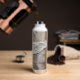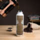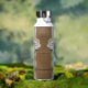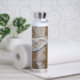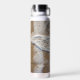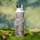 Water bottle with a double image of ocean whitewash on a sandy beach.