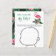 Baby shower invitation design features pink flamingo with lush green palm leaf fronds and tropical hibiscus flowers. "Aloha Baby". A tropical floral pattern with black background colour dresses up the back of the card.