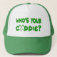 Humourous funny Golfer Cap for dad, mom and other loved ones family and friends. Who's Your Caddie? Funny golf pun print golfer hat features a green cap with Who's Your Caddie? print on white and green visor. Additional details include an adjustable snapback closure at the rear for one size fits all. You can customizable and make it personalized - add name, photo or image. You also have an option to replace existing design with your own design to create a truely personalized gift idea for your favourite golfer.