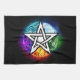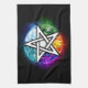 Artistically drawn, luminous pentagram with five magical elements, water, earth, fire, astral, air on black background. Wiccan pentagram. Wicca