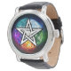 Artistically drawn, luminous pentagram with five magical elements, water, earth, fire, astral, air on black background. Wiccan pentagram. Wicca