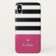 A modern wide horizontal stripes pattern iPhone X Case in black and white and with a deep pink accent. Personalize by adding your name beneath the chic retro daisy logo.