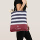 A modern wide horizontal stripes pattern tote bag in navy blue and red. Personalize by adding your name beneath the chic retro daisy logo.