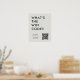 This stylish gray poster print sign provides a clean and modern way for customers or guests to access your wifi network instantly with bold typography quote "What's the WiFi Code?". The design features a central QR code area that can be linked to your wifi details so users can scan to connect without typing a password. Enter your network name and any custom instructions that fit your need. The minimalist layout keeps everything readable which works well for cafes, salons, studios, offices, rental properties, pop ups or event venues. Because the template is fully editable, it adapts easily to branding updates or new wifi information. A practical and polished solution that helps streamline customer access and elevates your in person experience.