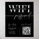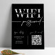 Minimalist black and white 'what's the WIFI code' poster with space for your custom network name and password, QR code. The modern script font and simple layout make this free public WIFI password sign super versatile to suit any brand or decor.