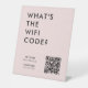 A simple custom pink "What's the WiFi Code?" scan to connect to Wifi business pedestal sign template in a modern minimalist style which can be easily updated with your QR code, network details or custom text.